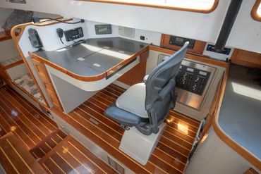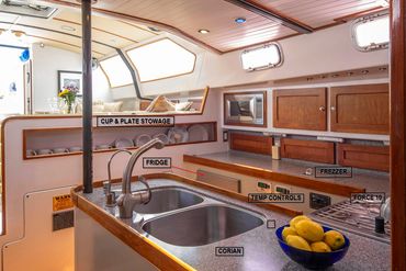 (DAN FOSS) REEFER, CORIAN COUNTERTOPS,XANTREX 3000 WATT CHARGER/INVERTER, VACUFLUSH TOILET (AFT) JABSCO ELECTRIC (FWD) FW FED, 3) EAST PENN 8D AGMS, SS HOT WATER HEATER, LED LIGHTING, SS SINKS, WATER PURIFIER, LOTS OF CABINETS, MICROWAVE, AC PLUGS, PRIVATE STANDUP SHOWER, 1/2" MAHOGANY MAPLE SOLE